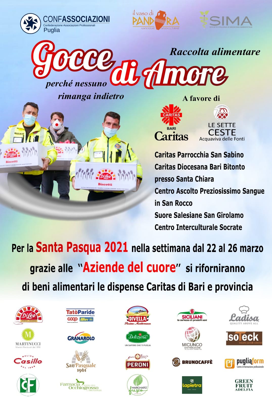 In occasione della Santa Pasqua 2021 a distanza di meno di tre mesi dall’ultima raccolta alimentare, Il Vaso di Pandora, presieduta da Severina Bergamo in collaborazione di Confassociazioni Puglia e SIMA, decidono di rispondere all’appello accorato dei referenti Caritas di Bari e Acquaviva delle Fonti. Infatti, dopo dieci raccolte con supporto diretto per oltre 150 famiglie bisognose, di cui ben tre nello scorso 2024 in pieno covid, quest’ultima raccolta avverrà con modalità differente: saranno sei centri Caritas di Bari ed Acquaviva delle Fonti destinatari delle scorte alimentari e che si occuperanno della distribuzione ai bisognosi di Bari ed Acquaviva delle Fonti.