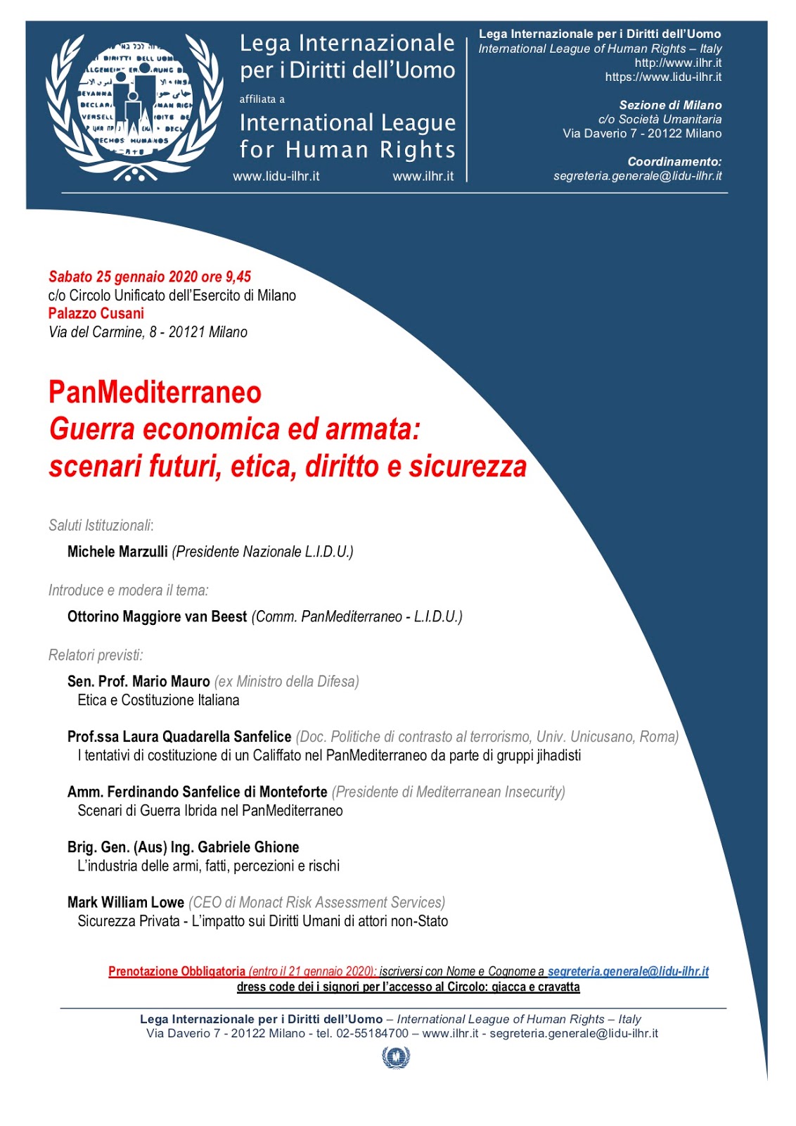 Di questi argomenti si dibatterà in occasione del convegno, organizzato dalla Lega Internazionale per i Diritti dell'Uomo, dal titolo "PanMediterraneo Guerra economica ed armata. Scenari futuri, etica, diritto e sicurezza" insieme a: Michele Marzulli, Presidente Nazionale L.I.D.U.; Ottorino Maggiore van Beest, Commissione PanMediterraneo - L.I.D.U., Sen. Prof. Mario Mauro, già Ministro della Difesa; Prof.ssa Laura Quadarella Sanfelice, Università Unicusano, Amm. Ferdinando Sanfelice di Monteforte, Presidente di Mediterranean Insecurity; Brig. Gen. (Aus) Ing. Gabriele Ghione; Mark William Lowe, CEO di Monact Risk Assessment Services.