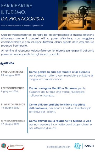 Parte dal 28 maggio prossimo un ciclo di webinar dal titolo "Far ripartire il Turismo, da protagonista”. Organizzati dalla Camera di Commercio di Perugia in collaborazione con Isnart, i quattro incontri - in programma fra il 28 e il 17 giugno - sono rivolti in particolar modo alle imprese turistiche, della ricettività e della ristorazione mentre si avvia l’auspicata “ripartenza”, per poter superare il difficile periodo che ha messo a dura prova tutta l'economia e, in modo particolare il turismo, settore nevralgico per il nostro territorio.
